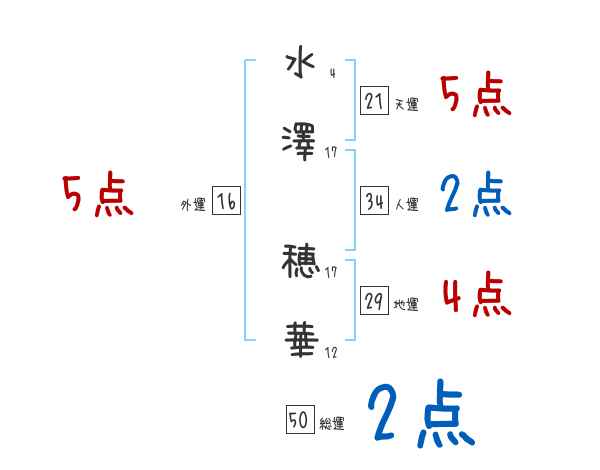 総運![]() | 水澤穂華さんの総運は50画の2つ星!浮き沈みが激しく不安定。しりすぼみに衰退しやすいので注意しましょう。 あなたの人生を表す1番重要な運勢です。生涯を通じて影響する総合運となり、主に50歳以降の晩年期に影響を及ぼします。 |