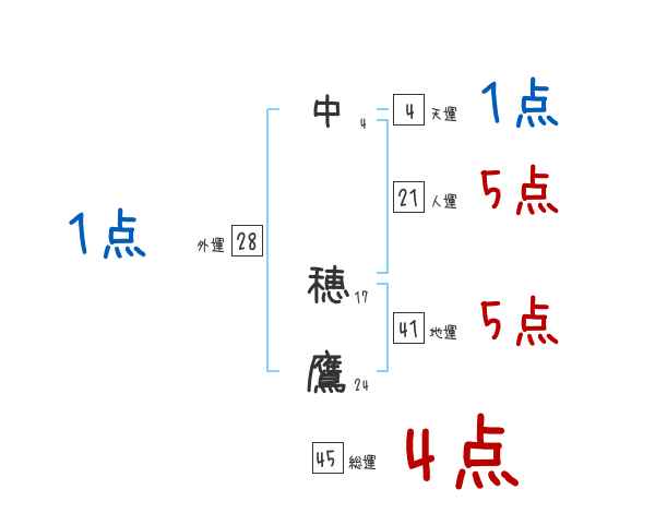 外運![]() | 中穂鷹さんの外運は28画の1つ星!家庭環境に注意。スポーツで活躍できる能力があるかも。 生活面を象徴する運勢です。外部から受ける影響力を表し、結婚運、家庭運や職場、環境への順応性を表します。 |