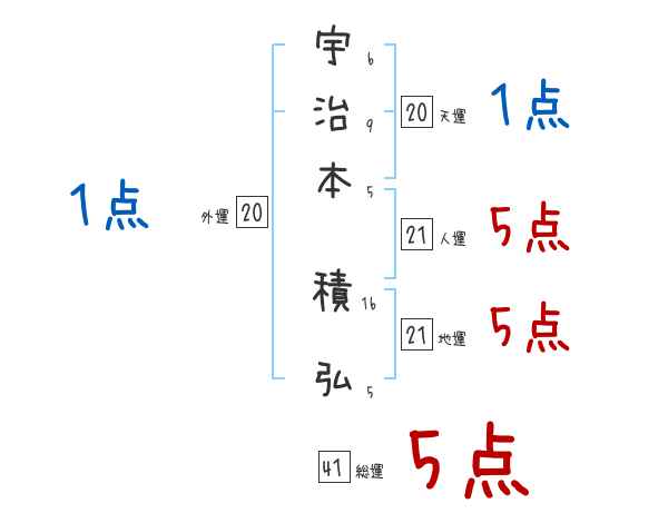 地運![]() | 宇治本積弘さんの地運は21画の5つ星!統率力がある。独立し成功する。名誉を手に入れる。 個性を表す基礎的な運勢です。性格形成や対人関係、行動力など家庭環境に影響されます。主に誕生してから20歳くらいまでの若年期の運勢を表します。 |