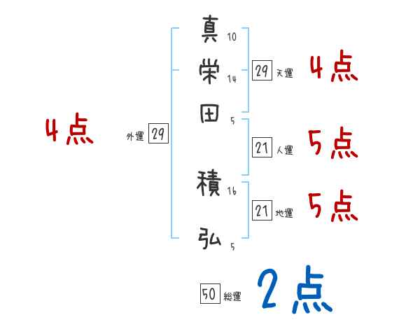 天運![]() | 真栄田積弘さんの天運は29画の4つ星!完全主義で才能がある。厳格な心の持ち主。 家系が持つ宿命的な運勢を表します。祖先から受け継いだ苗字ですので自分の力が及びません。家柄を象徴します。 |
