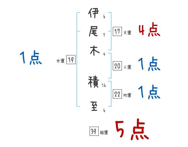 総運![]() | 伊尾木積至さんの総運は39画の5つ星!社交性に優れ人望が厚い。人の上に立ち成功する。 あなたの人生を表す1番重要な運勢です。生涯を通じて影響する総合運となり、主に50歳以降の晩年期に影響を及ぼします。 |