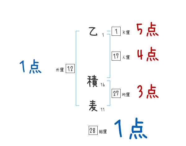 天運![]() | 乙積麦さんの天運は1画の5つ星!行動力、指導力があり出世し繁栄する。幸運に恵まれる。 家系が持つ宿命的な運勢を表します。祖先から受け継いだ苗字ですので自分の力が及びません。家柄を象徴します。 |
