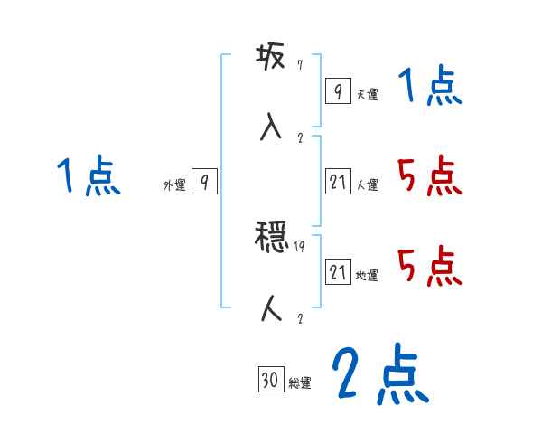 人運![]() | 坂入穏人さんの人運は21画の5つ星!統率力がある。独立し成功する。名誉を手に入れる。 性格や才能などを表す2番目に重要な運勢です。人間関係や協調性、社会的な成功に影響します。主に20歳から50歳ぐらいまでの中年期の運勢を表します。 |