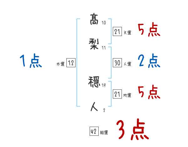 天運![]() | 髙梨穏人さんの天運は21画の5つ星!統率力がある。独立し成功する。名誉を手に入れる。 家系が持つ宿命的な運勢を表します。祖先から受け継いだ苗字ですので自分の力が及びません。家柄を象徴します。 |