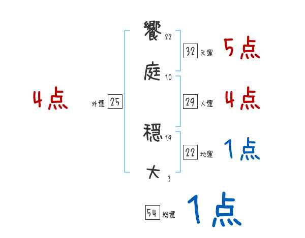 天運![]() | 饗庭穏大さんの天運は32画の5つ星!柔軟性があり成功する。チャンスが多く金運が良い。 家系が持つ宿命的な運勢を表します。祖先から受け継いだ苗字ですので自分の力が及びません。家柄を象徴します。 |