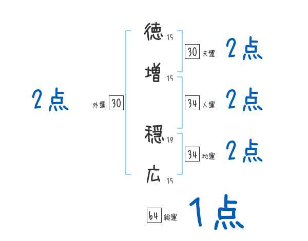 天運![]() | 徳増穏広さんの天運は30画の2つ星!浮き沈みの激しさに注意しましょう。 家系が持つ宿命的な運勢を表します。祖先から受け継いだ苗字ですので自分の力が及びません。家柄を象徴します。 |
