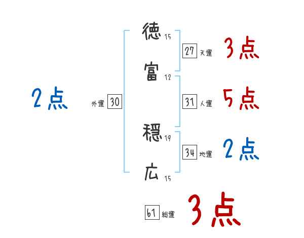 外運![]() | 徳富穏広さんの外運は30画の2つ星!浮き沈みの激しさに注意しましょう。 生活面を象徴する運勢です。外部から受ける影響力を表し、結婚運、家庭運や職場、環境への順応性を表します。 |