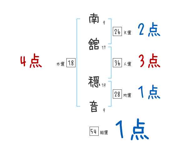 人運![]() | 南舘穏音さんの人運は36画の3つ星!先見性が豊かです。多少神経質で苦労することも。 性格や才能などを表す2番目に重要な運勢です。人間関係や協調性、社会的な成功に影響します。主に20歳から50歳ぐらいまでの中年期の運勢を表します。 |