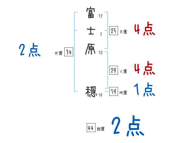 総運![]() | 富士原穏さんの総運は44画の2つ星!誠実で慎重な性格。物事を考えすぎないように注意しましょう。 あなたの人生を表す1番重要な運勢です。生涯を通じて影響する総合運となり、主に50歳以降の晩年期に影響を及ぼします。 |