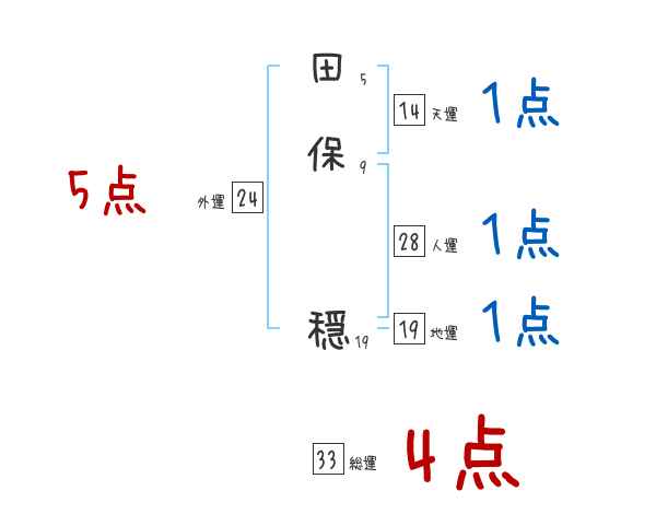 外運![]() | 田保穏さんの外運は24画の5つ星!家庭運が良く順調な人生。金運にも恵まれる。 生活面を象徴する運勢です。外部から受ける影響力を表し、結婚運、家庭運や職場、環境への順応性を表します。 |