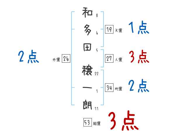 総運![]() | 和多田穣一朗さんの総運は53画の3つ星!やや見栄っ張りで虚栄心がある。散財に注意。 あなたの人生を表す1番重要な運勢です。生涯を通じて影響する総合運となり、主に50歳以降の晩年期に影響を及ぼします。 |