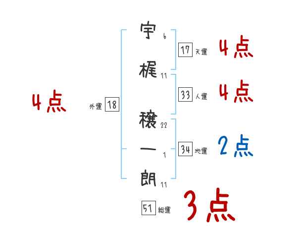 外運![]() | 宇梶穣一朗さんの外運は18画の4つ星!情熱的で剛気。忍耐力があり信頼される。 生活面を象徴する運勢です。外部から受ける影響力を表し、結婚運、家庭運や職場、環境への順応性を表します。 |