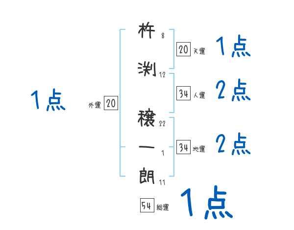 総運![]() | 杵渕穣一朗さんの総運は54画の1つ星!トラブルが多いかも。周りをよく見て協調して過ごしましょう。 あなたの人生を表す1番重要な運勢です。生涯を通じて影響する総合運となり、主に50歳以降の晩年期に影響を及ぼします。 |