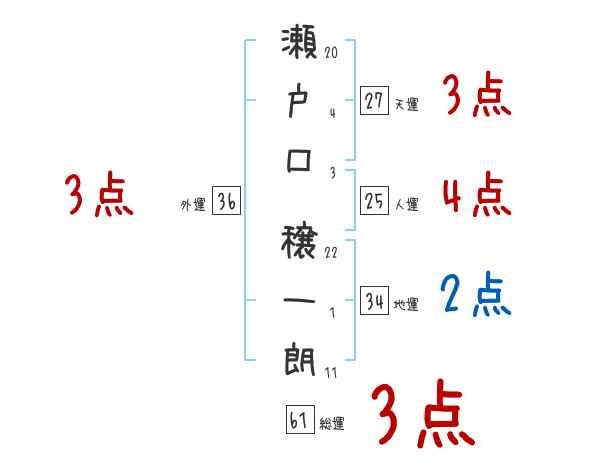 外運![]() | 瀬戸口穣一朗さんの外運は36画の3つ星!先見性が豊かです。多少神経質で苦労することも。 生活面を象徴する運勢です。外部から受ける影響力を表し、結婚運、家庭運や職場、環境への順応性を表します。 |