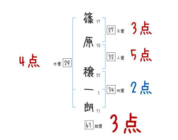 人運![]() | 篠原穣一朗さんの人運は32画の5つ星!柔軟性があり成功する。チャンスが多く金運が良い。 性格や才能などを表す2番目に重要な運勢です。人間関係や協調性、社会的な成功に影響します。主に20歳から50歳ぐらいまでの中年期の運勢を表します。 |