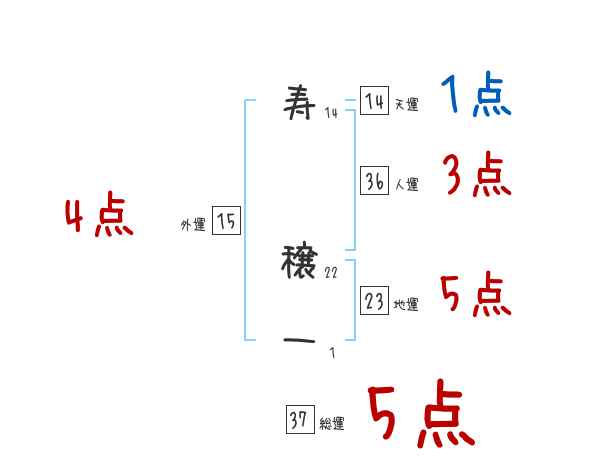 外運![]() | 寿穣一さんの外運は15画の4つ星!人徳があり出世する。順調に物事を進め円満な人生。 生活面を象徴する運勢です。外部から受ける影響力を表し、結婚運、家庭運や職場、環境への順応性を表します。 |