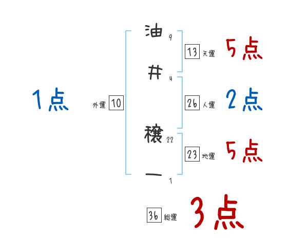天運![]() | 油井穣一さんの天運は13画の5つ星!才能に恵まれ人気がある。名声を手に入れる。円満な人生。 家系が持つ宿命的な運勢を表します。祖先から受け継いだ苗字ですので自分の力が及びません。家柄を象徴します。 |