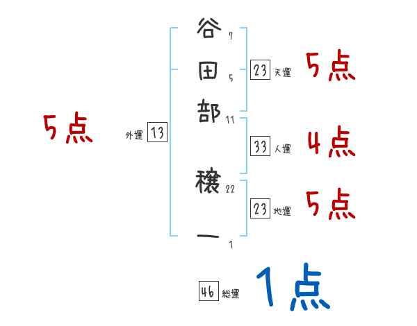 天運![]() | 谷田部穣一さんの天運は23画の5つ星!想像力に優れ活力がある。一代で成功し名誉を手に入れる。 家系が持つ宿命的な運勢を表します。祖先から受け継いだ苗字ですので自分の力が及びません。家柄を象徴します。 |