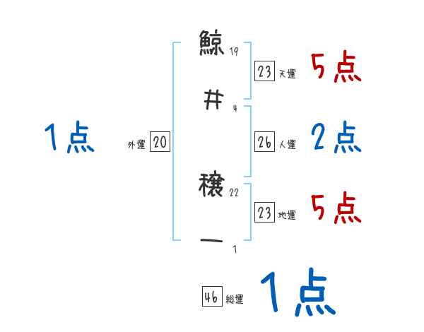 総運![]() | 鯨井穣一さんの総運は46画の1つ星!迷走することが多く苦労するかも。目先のことにとらわれないように。 あなたの人生を表す1番重要な運勢です。生涯を通じて影響する総合運となり、主に50歳以降の晩年期に影響を及ぼします。 |