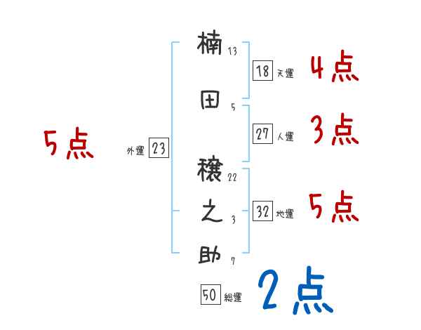 地運![]() | 楠田穣之助さんの地運は32画の5つ星!柔軟性があり成功する。チャンスが多く金運が良い。 個性を表す基礎的な運勢です。性格形成や対人関係、行動力など家庭環境に影響されます。主に誕生してから20歳くらいまでの若年期の運勢を表します。 |