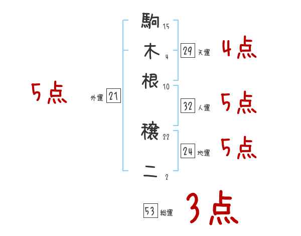 総運![]() | 駒木根穣二さんの総運は53画の3つ星!やや見栄っ張りで虚栄心がある。散財に注意。 あなたの人生を表す1番重要な運勢です。生涯を通じて影響する総合運となり、主に50歳以降の晩年期に影響を及ぼします。 |
