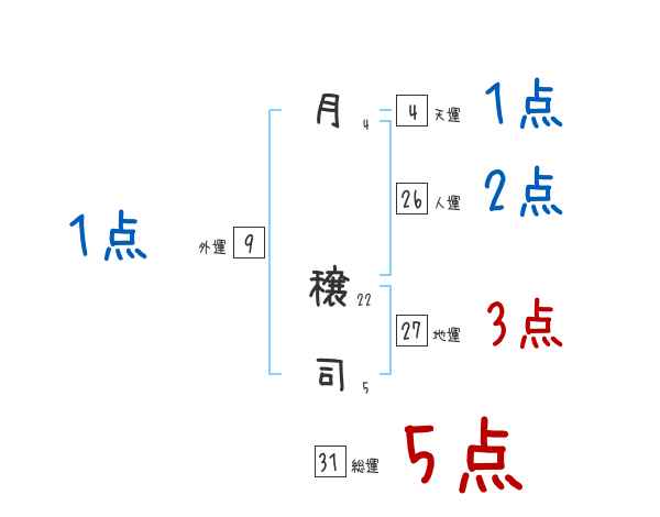 天運![]() | 月穣司さんの天運は4画の1つ星!感情が不安定で苦労するかも。周囲との協調を心掛けましょう。 家系が持つ宿命的な運勢を表します。祖先から受け継いだ苗字ですので自分の力が及びません。家柄を象徴します。 |