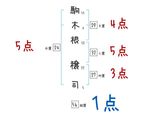 外運![]() | 駒木根穣司さんの外運は24画の5つ星!家庭運が良く順調な人生。金運にも恵まれる。 生活面を象徴する運勢です。外部から受ける影響力を表し、結婚運、家庭運や職場、環境への順応性を表します。 |