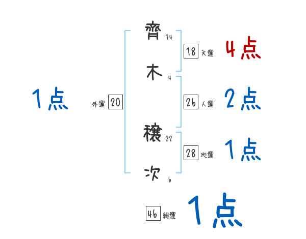天運![]() | 齊木穣次さんの天運は18画の4つ星!情熱的で剛気。忍耐力があり信頼される。 家系が持つ宿命的な運勢を表します。祖先から受け継いだ苗字ですので自分の力が及びません。家柄を象徴します。 |