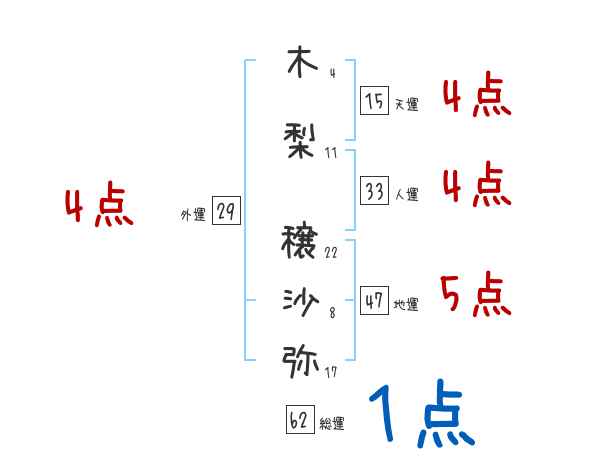 天運![]() | 木梨穣沙弥さんの天運は15画の4つ星!人徳があり出世する。順調に物事を進め円満な人生。 家系が持つ宿命的な運勢を表します。祖先から受け継いだ苗字ですので自分の力が及びません。家柄を象徴します。 |