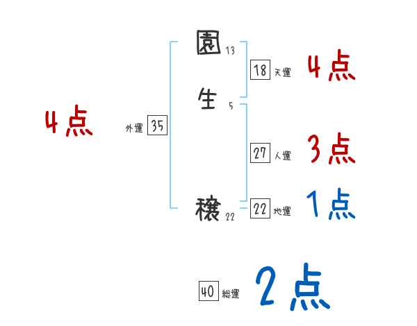 天運![]() | 園生穣さんの天運は18画の4つ星!情熱的で剛気。忍耐力があり信頼される。 家系が持つ宿命的な運勢を表します。祖先から受け継いだ苗字ですので自分の力が及びません。家柄を象徴します。 |