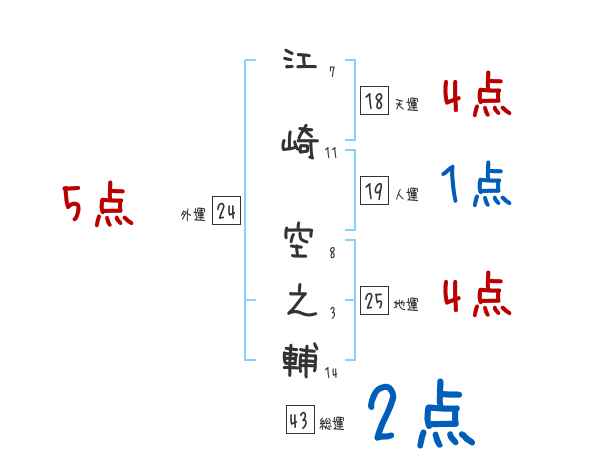 外運![]() | 江崎空之輔さんの外運は24画の5つ星!家庭運が良く順調な人生。金運にも恵まれる。 生活面を象徴する運勢です。外部から受ける影響力を表し、結婚運、家庭運や職場、環境への順応性を表します。 |