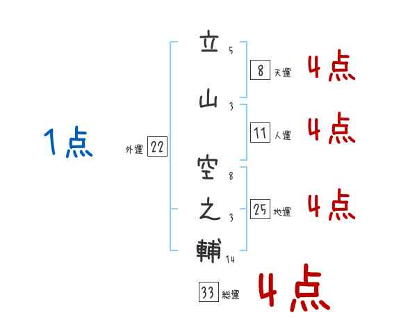外運![]() | 立山空之輔さんの外運は22画の1つ星!努力することが苦手ないっぽう手先が器用。芸術性にも優れる。 生活面を象徴する運勢です。外部から受ける影響力を表し、結婚運、家庭運や職場、環境への順応性を表します。 |