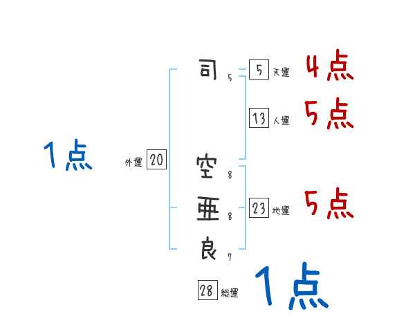 総運![]() | 司空亜良さんの総運は28画の1つ星!家庭環境に注意。スポーツで活躍できる能力があるかも。 あなたの人生を表す1番重要な運勢です。生涯を通じて影響する総合運となり、主に50歳以降の晩年期に影響を及ぼします。 |