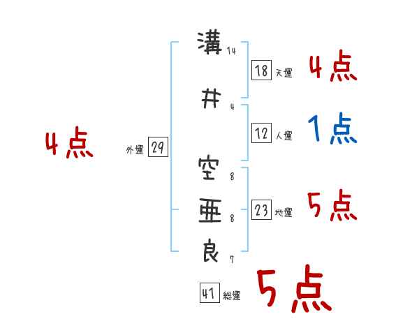 外運![]() | 溝井空亜良さんの外運は29画の4つ星!完全主義で才能がある。厳格な心の持ち主。 生活面を象徴する運勢です。外部から受ける影響力を表し、結婚運、家庭運や職場、環境への順応性を表します。 |