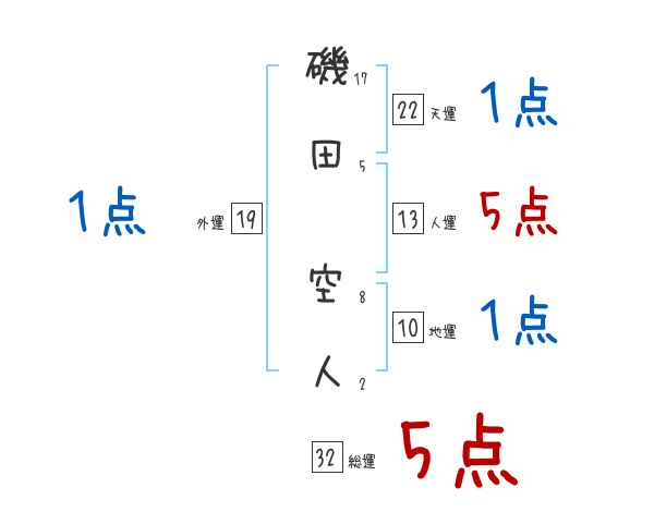 天運![]() | 磯田空人さんの天運は22画の1つ星!努力することが苦手ないっぽう手先が器用。芸術性にも優れる。 家系が持つ宿命的な運勢を表します。祖先から受け継いだ苗字ですので自分の力が及びません。家柄を象徴します。 |