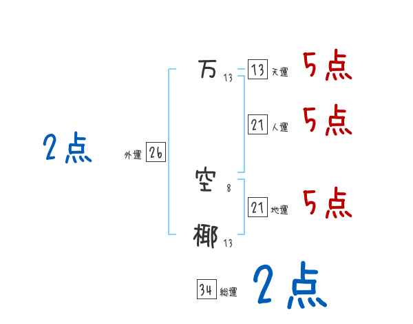 総運![]() | 万空椰さんの総運は34画の2つ星!独創性に優れるが、自尊心が強く災難に注意しましょう。 あなたの人生を表す1番重要な運勢です。生涯を通じて影響する総合運となり、主に50歳以降の晩年期に影響を及ぼします。 |