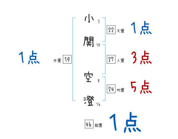 天運![]() | 小関空澄さんの天運は22画の1つ星!努力することが苦手ないっぽう手先が器用。芸術性にも優れる。 家系が持つ宿命的な運勢を表します。祖先から受け継いだ苗字ですので自分の力が及びません。家柄を象徴します。 |