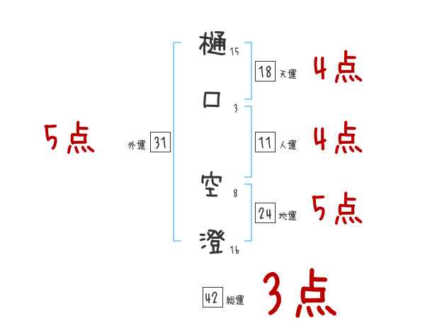 天運![]() | 樋口空澄さんの天運は18画の4つ星!情熱的で剛気。忍耐力があり信頼される。 家系が持つ宿命的な運勢を表します。祖先から受け継いだ苗字ですので自分の力が及びません。家柄を象徴します。 |