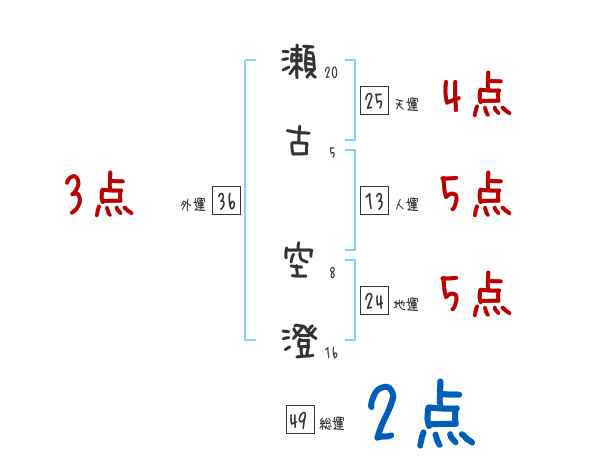外運![]() | 瀬古空澄さんの外運は36画の3つ星!先見性が豊かです。多少神経質で苦労することも。 生活面を象徴する運勢です。外部から受ける影響力を表し、結婚運、家庭運や職場、環境への順応性を表します。 |