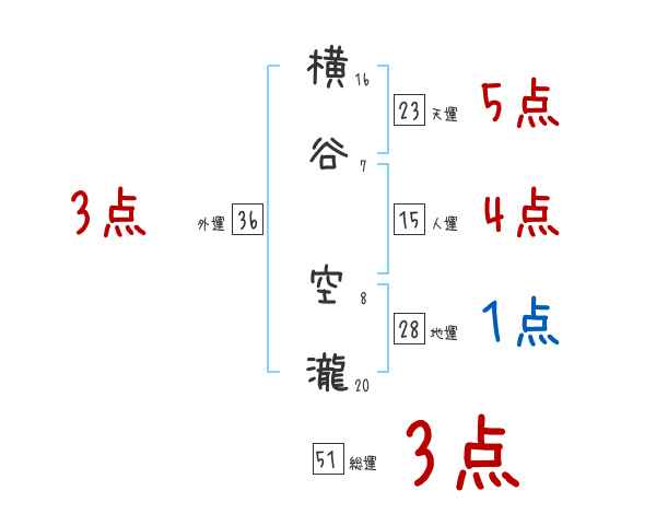 天運![]() | 横谷空瀧さんの天運は23画の5つ星!想像力に優れ活力がある。一代で成功し名誉を手に入れる。 家系が持つ宿命的な運勢を表します。祖先から受け継いだ苗字ですので自分の力が及びません。家柄を象徴します。 |