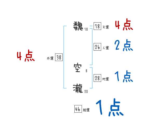 天運![]() | 魏空瀧さんの天運は18画の4つ星!情熱的で剛気。忍耐力があり信頼される。 家系が持つ宿命的な運勢を表します。祖先から受け継いだ苗字ですので自分の力が及びません。家柄を象徴します。 |