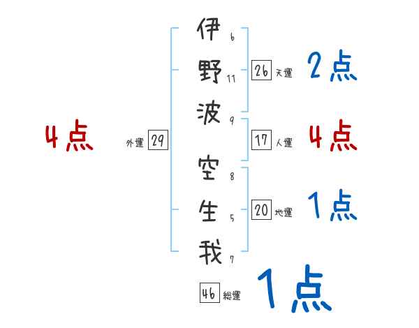 天運![]() | 伊野波空生我さんの天運は26画の2つ星!波瀾万丈かも。信頼できる人を大事にしましょう。 家系が持つ宿命的な運勢を表します。祖先から受け継いだ苗字ですので自分の力が及びません。家柄を象徴します。 |