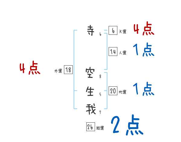 天運![]() | 寺空生我さんの天運は6画の4つ星!慎重な努力家で信頼を得る。誠実な精神で向上心に優れる。 家系が持つ宿命的な運勢を表します。祖先から受け継いだ苗字ですので自分の力が及びません。家柄を象徴します。 |