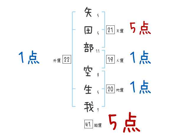 天運![]() | 矢田部空生我さんの天運は21画の5つ星!統率力がある。独立し成功する。名誉を手に入れる。 家系が持つ宿命的な運勢を表します。祖先から受け継いだ苗字ですので自分の力が及びません。家柄を象徴します。 |
