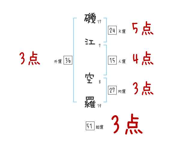 総運![]() | 磯江空羅さんの総運は51画の3つ星!変化が激しく、危険に注意。堅実な性格。 あなたの人生を表す1番重要な運勢です。生涯を通じて影響する総合運となり、主に50歳以降の晩年期に影響を及ぼします。 |