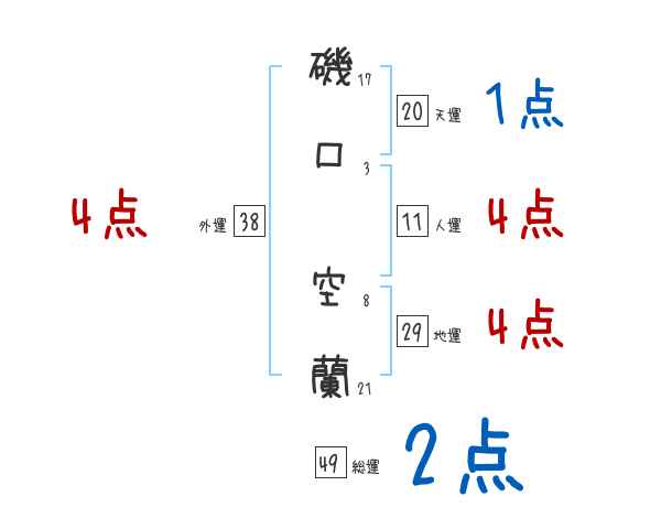 外運![]() | 磯口空蘭さんの外運は38画の4つ星!温厚な性格で技術的な才能を発揮する。職人的な仕事に向いている。 生活面を象徴する運勢です。外部から受ける影響力を表し、結婚運、家庭運や職場、環境への順応性を表します。 |