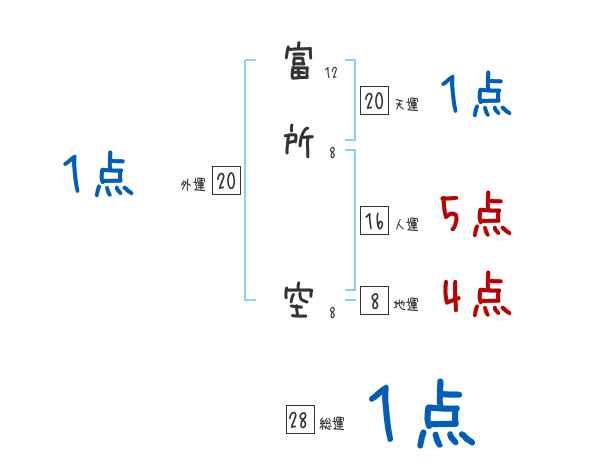 人運![]() | 富所空さんの人運は16画の5つ星!人望が厚く大きく発展する。逆転成功が見える。 性格や才能などを表す2番目に重要な運勢です。人間関係や協調性、社会的な成功に影響します。主に20歳から50歳ぐらいまでの中年期の運勢を表します。 |