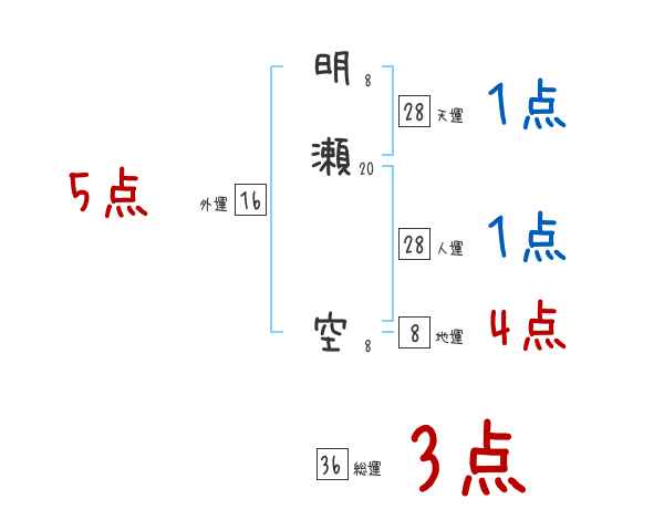 天運![]() | 明瀬空さんの天運は28画の1つ星!家庭環境に注意。スポーツで活躍できる能力があるかも。 家系が持つ宿命的な運勢を表します。祖先から受け継いだ苗字ですので自分の力が及びません。家柄を象徴します。 |