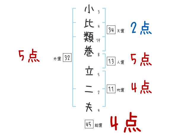 外運![]() | 小比類巻立二夫さんの外運は32画の5つ星!柔軟性があり成功する。チャンスが多く金運が良い。 生活面を象徴する運勢です。外部から受ける影響力を表し、結婚運、家庭運や職場、環境への順応性を表します。 |