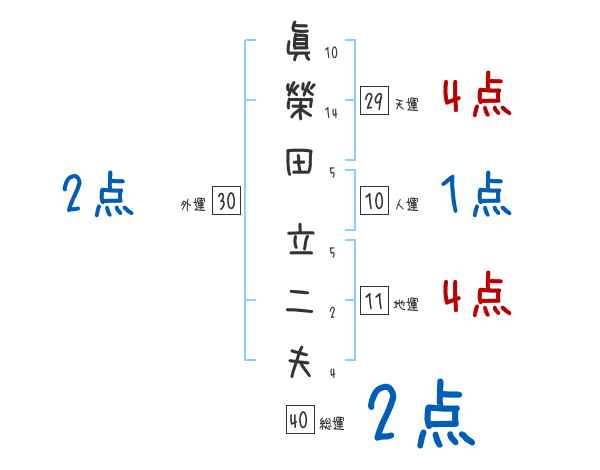 天運![]() | 眞榮田立二夫さんの天運は29画の4つ星!完全主義で才能がある。厳格な心の持ち主。 家系が持つ宿命的な運勢を表します。祖先から受け継いだ苗字ですので自分の力が及びません。家柄を象徴します。 |